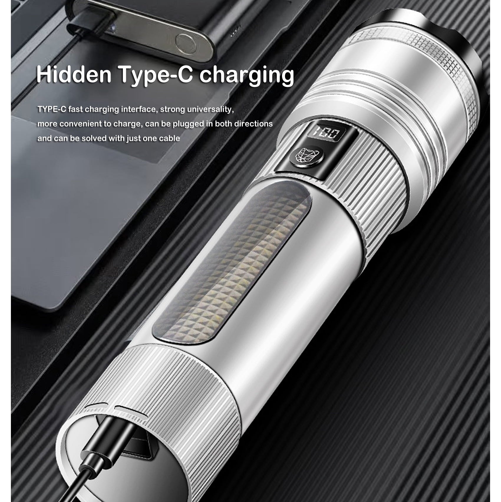【Mobile power bank/strong battery life 】Hidden Type-C fast charging interface, with strong compatibility for both forward and reverse insertion. The rechargeable flashlight is equipped with a large capacity battery, which can work for 8-24 hours after being fully charged. It can also charge mobile phones, rejecting battery anxiety and making it the king of outdoor activities