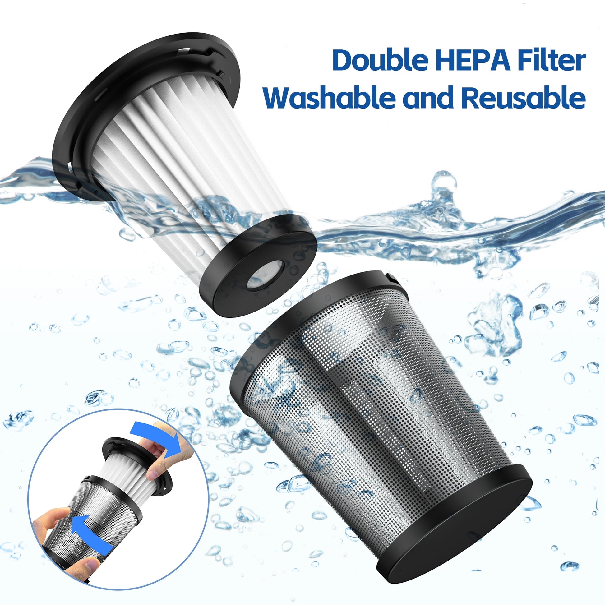 【Double Flitration Upgraded Hepa Filter】The handheld vacuum cleaner adopts the latest double filtration technology, which is an additional layer of metal filter on top of the normal HEPA filter, which can further improve the filtration efficiency and reduce dust overflow.This design also extends the life of the vacuum cleaner and we recommend that you wash and air dry your HEPA filter after a period of use to ensure a better experience.