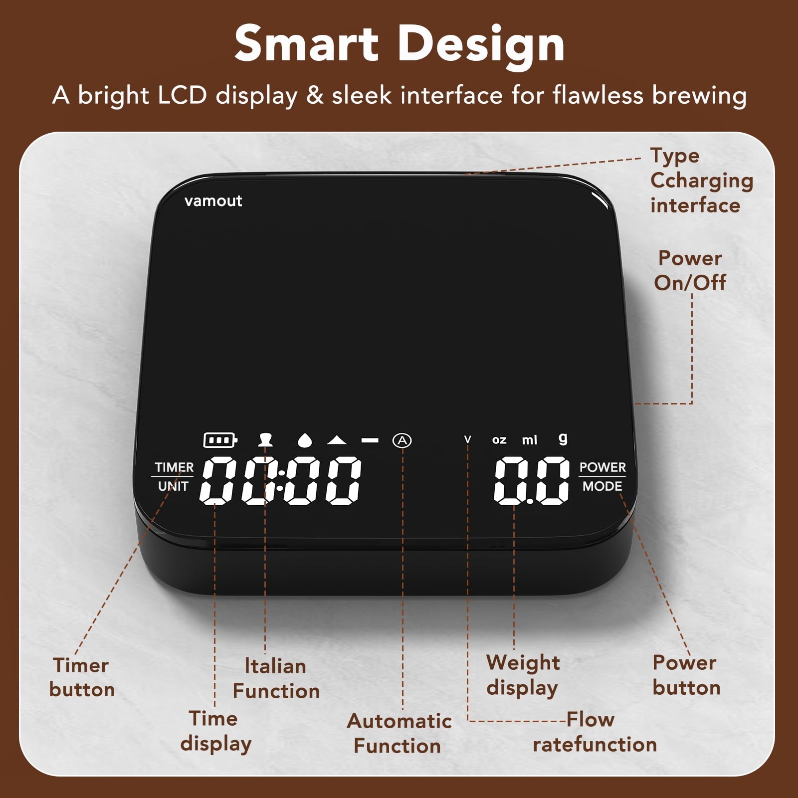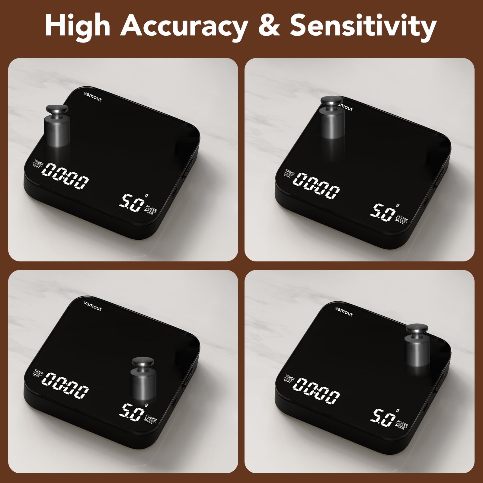 【Compact and Portable】Vamout mini coffee scale measures just 4.13*4.13*0.78 inches and weighs only 0.75 pounds, making it an ideal espresso accessories scale for coffee lovers on the go. Perfect as a portable coffee scale for outdoor brewing.