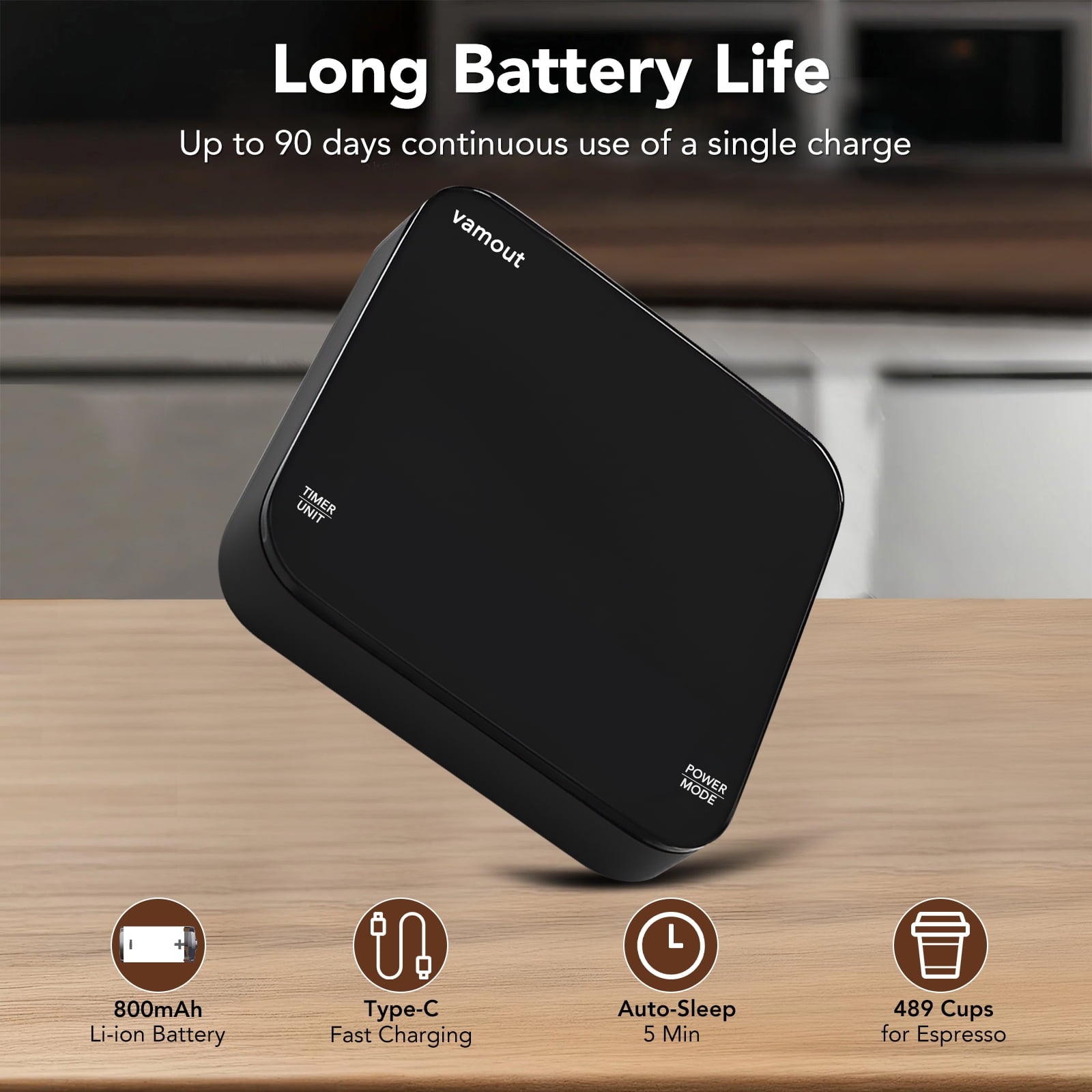 【Long-lasting Rechargeable Battery】 With a built-in 500 mAh lithium battery and a USB-C charging cable in the package, this digital coffee scale offers up to 90 days of use on a single charge. It’s the perfect espresso machine accessory that saves energy with its auto sleep mode after 5 minutes of inactivity.